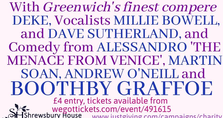 We have Greenwich's finest compere, Deke, the fantastically funny Boothby Graffoe, and amazing singer Millie Bowell with more to be confirmed!