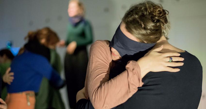ACCESS: each audience member is blindfolded and hugged by a singer. Unable to visually gauge their surroundings, participants experience the performance through sound, breath and vibrations of the body.
