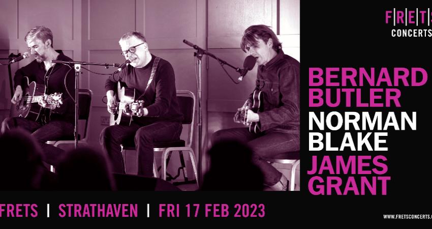 FRETS had the honour of bringing together the esteemed talents of Norman Blake, Bernard Butler and James Grant for acoustic concerts early in 2022. The concerts were fantastic, a major success with the public and critics alike. Norman, Bernard and James dipped into their collective catalogue (Teenage Fanclub, Suede, McAlmont & Butler, Solo, Friends Again, Love & Money) to present an acoustic show that delivered some joyous moments (patter included). FRETS is delighted to announce Blake, Butler and Grant will be returning to the Strathaven Hotel on Friday 17th Feb for their only Scottish date.